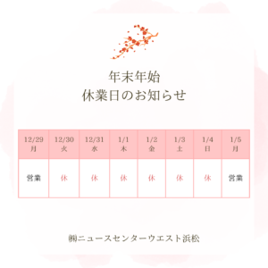 年末年始休業期間:12/30(火)~1/4(日)